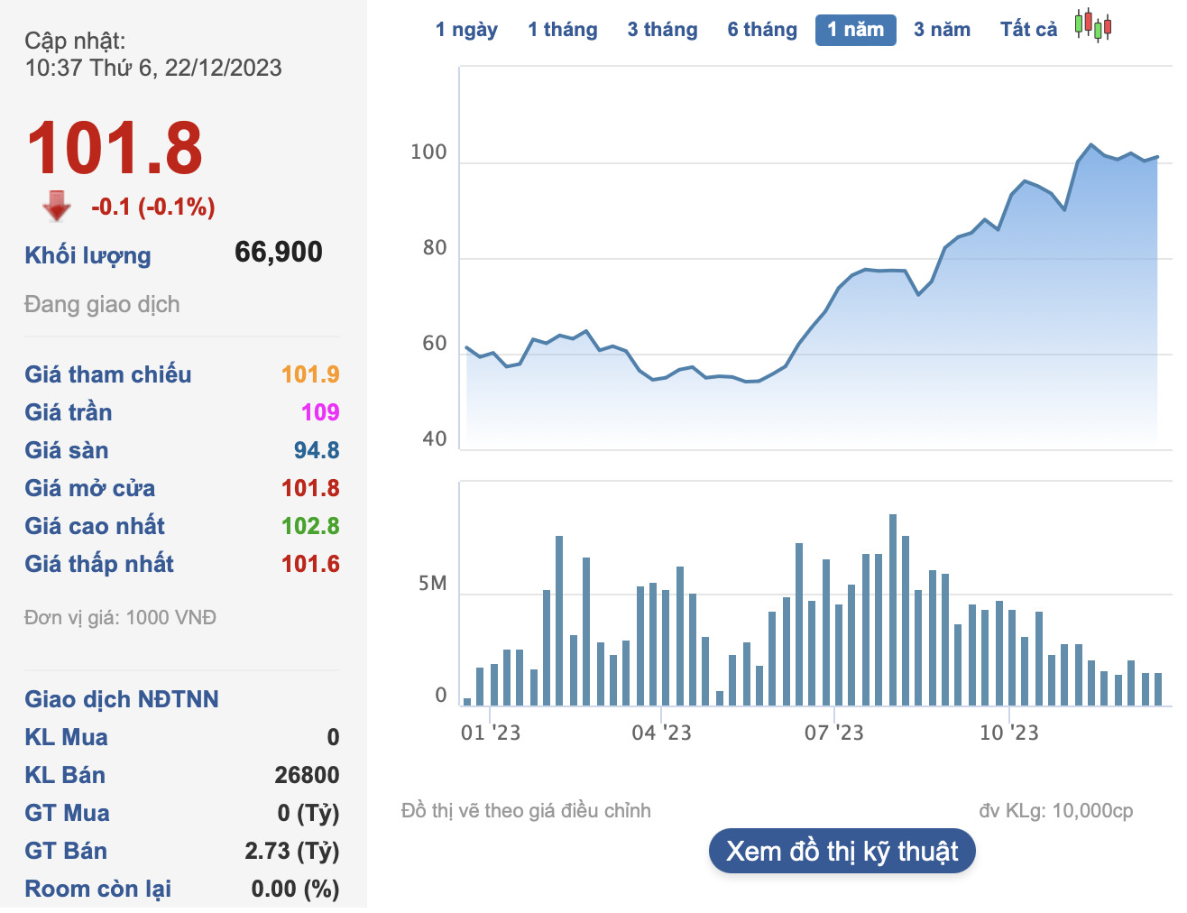 Động thái của Dragon Capital diễn ra trong bối cảnh cổ phiếu FRT đi lên mạnh mẽ và đạt đỉnh vào hồi giữa tháng 11/2023. Cổ phiếu này hiện vẫn đang neo giá gần vùng đỉnh và kết phiên giao dịch ngày 21/12 tại 101.900 đồng/cổ phiếu. So với thời điểm đầu năm 2023, FRT đã tăng gần 72% thị giá.